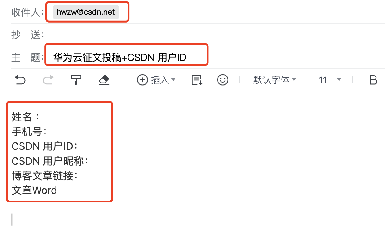 邮件内容为:姓名 + 手机号 + CSDN 用户ID+CSDN 用户昵称+博客文章链接+文章Word