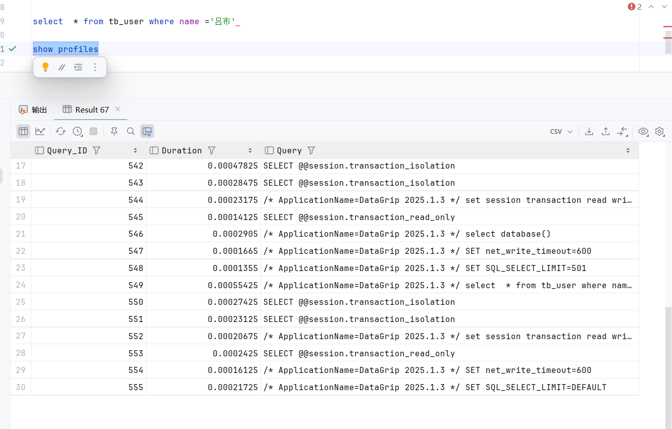 如题,我上一条sql语句是查询‘吕布’,然后执行show profiles显示的结果却是其他的,profiling_history_size默认15我也改了 但是不管改成多少还是显示其他的