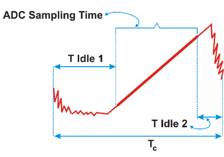 每个线性调频脉冲包含 64 个 ADC 样本。两行数据分别对应 800 帧。每帧包含两个子帧。子帧 1 包含 17 个线性调频脉冲,子帧 2 包含 15 个线性调频脉冲。因此,每行包含 (64 个 ADC 样本/线性调频脉冲 × (17 个线性调频脉冲/子帧 1 + 15 个线性调频脉冲/子帧 2) × 800 帧 = ) 1683400 个复数。