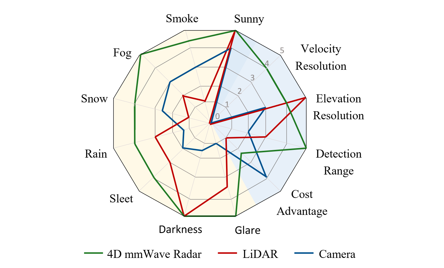 作为替代方案,4D 毫米波 (mmWave) 雷达因其体积小、成本效益高、测速能力强、探测距离远以及全天候适应性而被广泛应用 [9]。它通过增加高度测量功能增强了传统的 3D 毫米波雷达,从而能够获取 3D 空间信息。与其他传感器相比,4D 毫米波雷达能够穿透细小的空气颗粒,在具有挑战性的环境中实现持续可靠的运行 [10]。图 2 详细比较了摄像头、激光雷达和 4D 毫米波雷达在不同环境下的性能及其特性。比较结果表明,4D 毫米波雷达在雨雪、雨夹雪、雾和烟雾条件下的表现均优于激光雷达和摄像头,具有更佳的探测距离和测速能力。因此,仅采用 4D 毫米波雷达的方法能够在稳健性和成本效益之间取得平衡。与其他传感器融合时,4D 毫米波雷达可有效弥补摄像头和激光雷达的局限性,克服探测范围短、在恶劣环境下性能下降等问题。