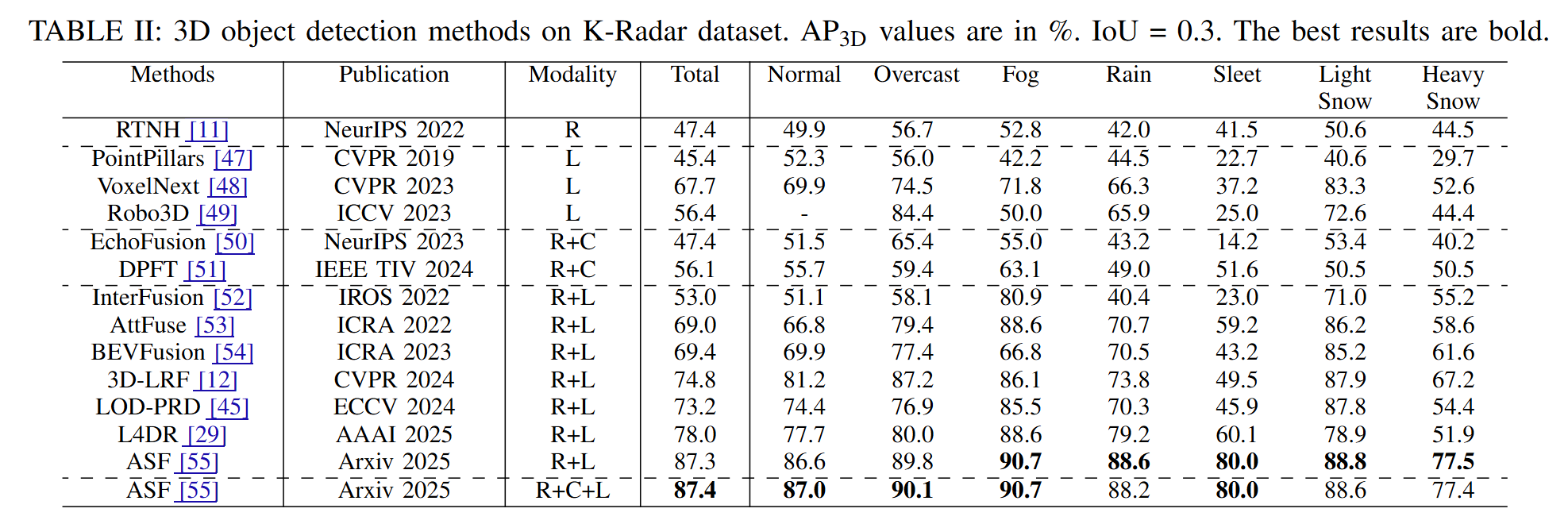 许多研究提出了通用策略来增强在多种恶劣环境下的鲁棒性。尽管已经发布了更多包含极端天气的数据集,但 K-Radar [11] 仍然是使用最广泛的基准。因此,我们首先使用 K-Radar [11] 分析了恶劣天气条件下的检测方法。表 II 总结了 K-Radar [11] 在恶劣天气下的 3D 目标检测方法。
