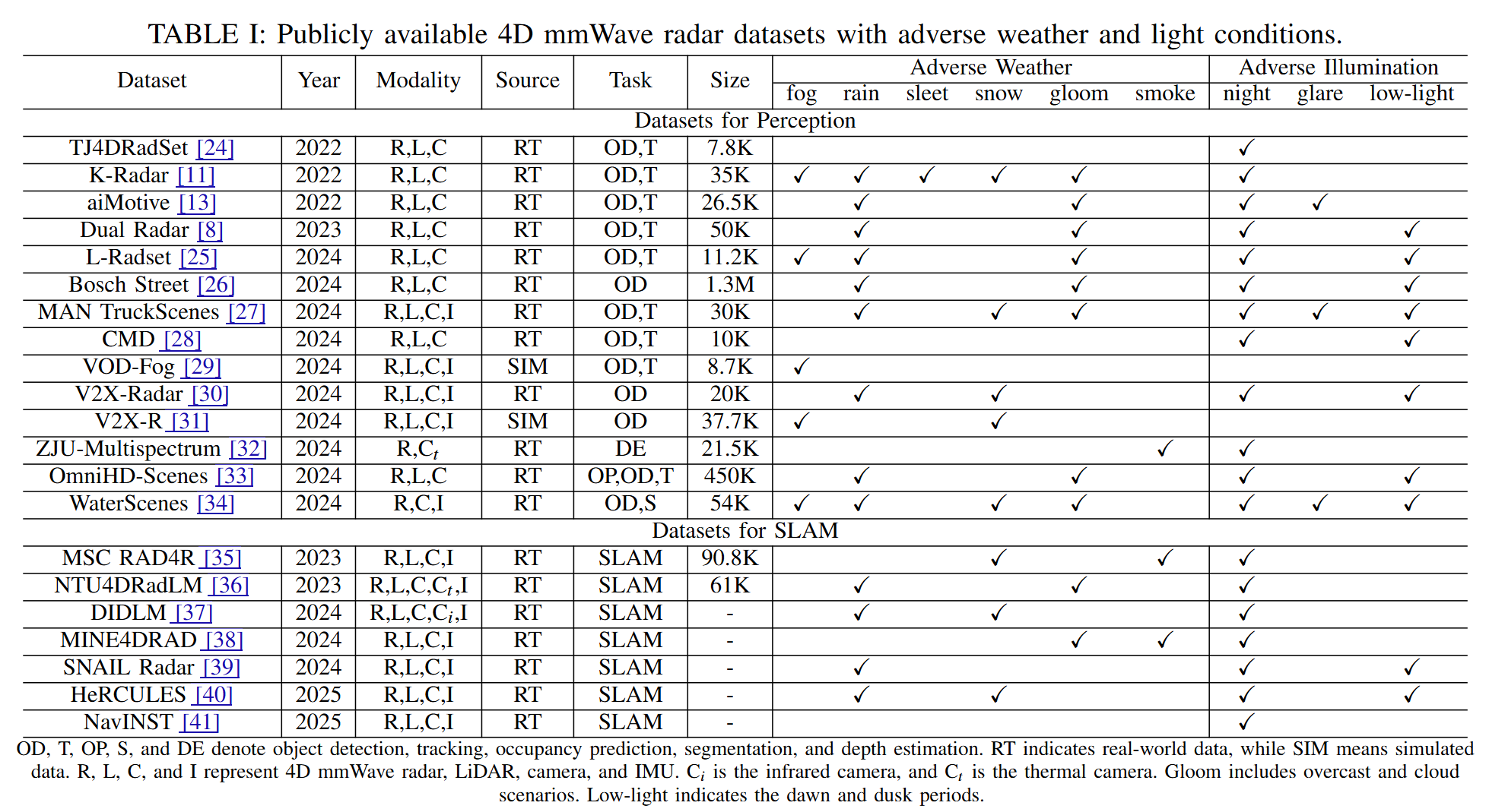 • 详细概述了恶劣环境下感知和 SLAM 的 4D 毫米波雷达数据集,涵盖了各种天气和光照条件。