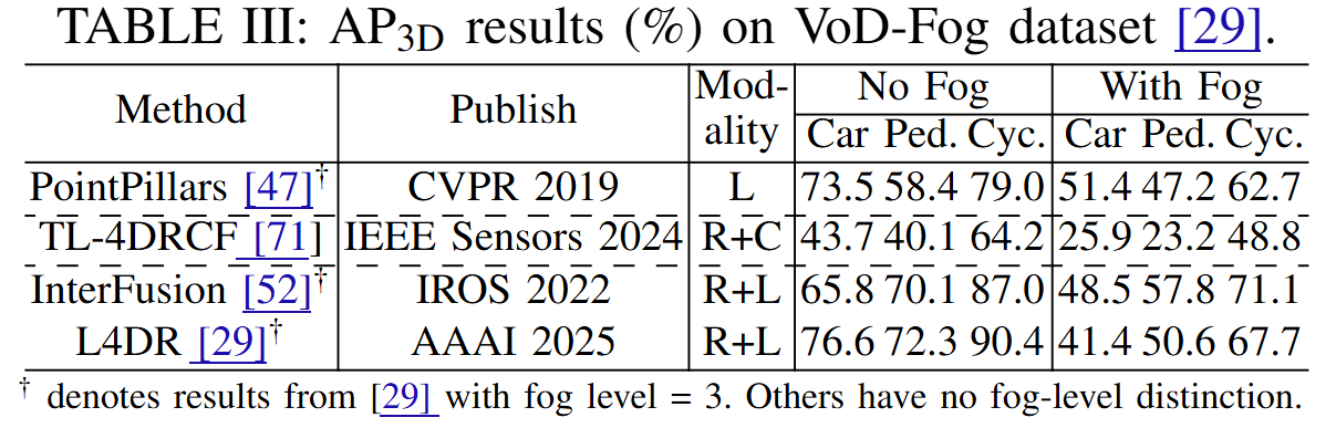 由于雾和烟粒子的尺寸与波长之间存在很大差异,因此对毫米波的影响可以忽略不计[69]。相比之下,雾和烟对激光雷达的影响最大,因为它们的消光系数和后向散射系数较高[70]。此外,它们还会降低相机的图像对比度。因此,可以使用4D毫米波雷达来补偿雾和烟在激光雷达和相机传感中造成的遮挡。因此,一些方法在现实世界的激光雷达或相机数据上模拟雾,并将其与4D毫米波雷达数据融合,以提高鲁棒性。表3展示了在VoD-Fog数据集[29]上使用不同方法的实验结果。TL4DRCF[71]实现了4D毫米波雷达和相机数据的两阶段融合。首先将4D毫米波雷达点云投影到相机坐标系下。随后,体素和像素通过视锥关联和交叉注意机制相互关联。该方法在雾天表现出卓越的鲁棒性。类似地,L4DR [29] 在 VoD 数据集 [17] 上模拟了不同程度的雾。在多级融合过程中,4D 毫米波雷达有效地滤除了 LiDAR 的雾天噪声。