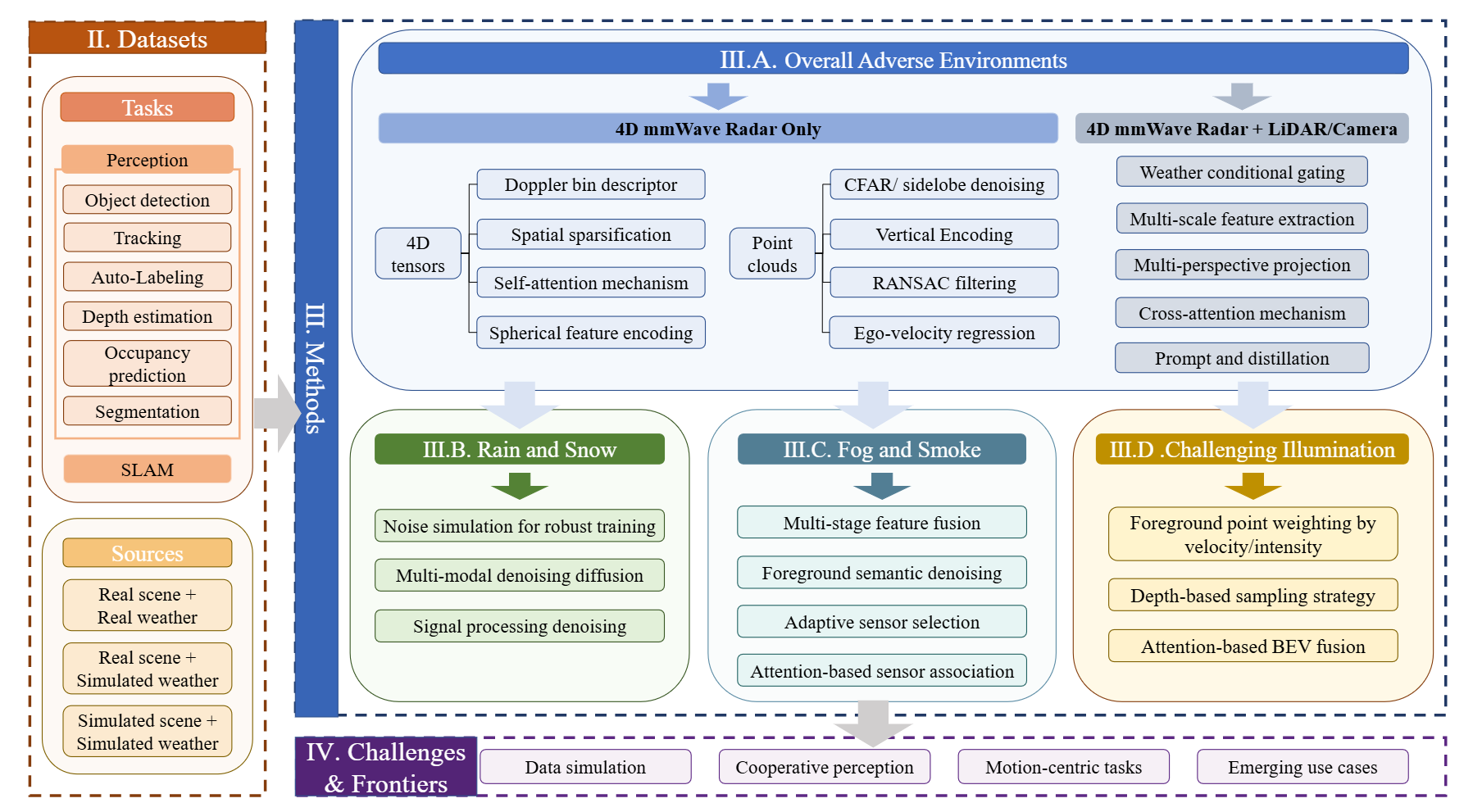 • 分析了现有的使用 4D 毫米波雷达增强恶劣环境下性能的基于深度学习的模型,包括针对多种条件的通用策略和针对特定天气的专用技术。