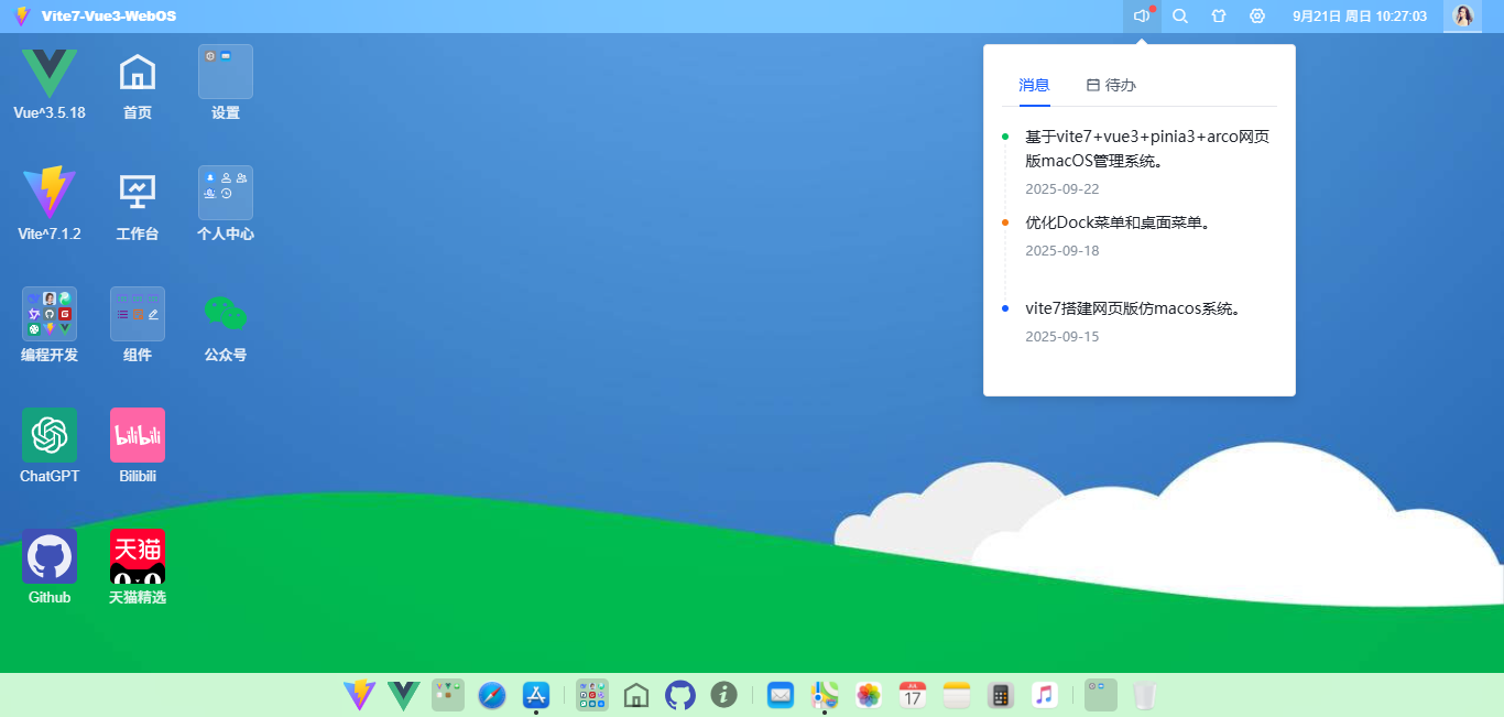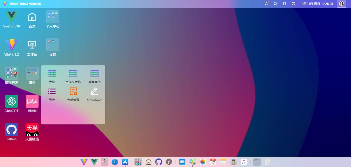 vite7-vue3-webos提供了macos+window两种风格桌面布局模板。