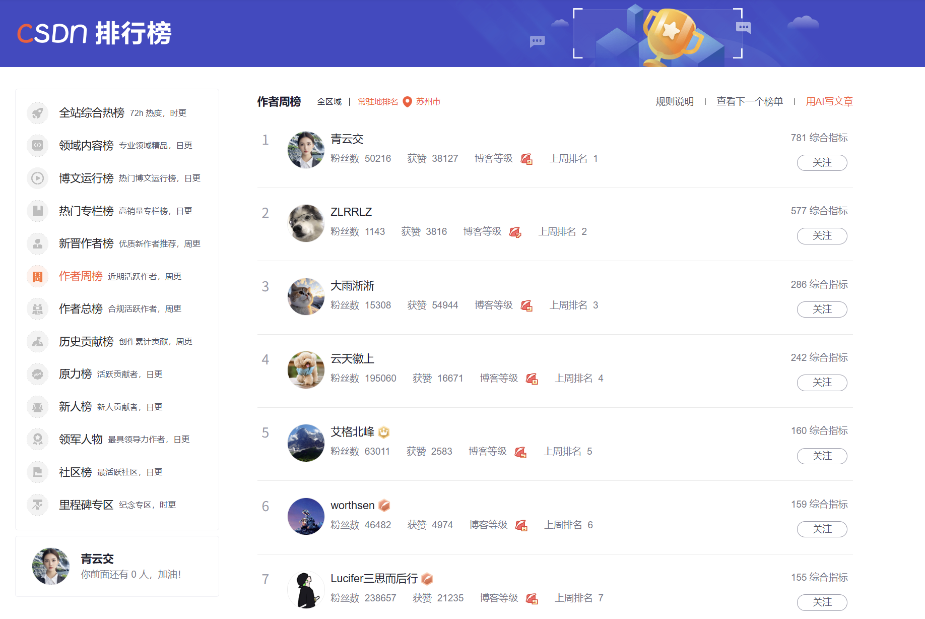 【青云交】荣登 CSDN 四榜 榜首有图有真相(20250630): https://bbs.csdn.net/topics/619768068 (New) 10022