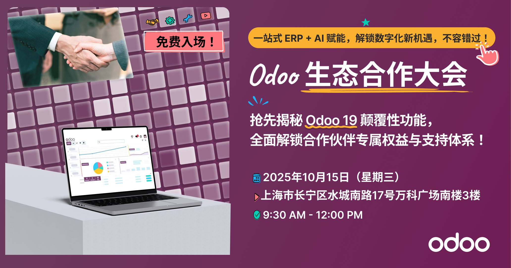 2025 年 10 月 15 日,上海 —— 这座汇聚中国顶尖科创力量的城市,将迎来Odoo 生态合作大会交流专场,为您打开企业数字化的全新想象空间,让您告别盲目探索,精准切入企业服务蓝海!