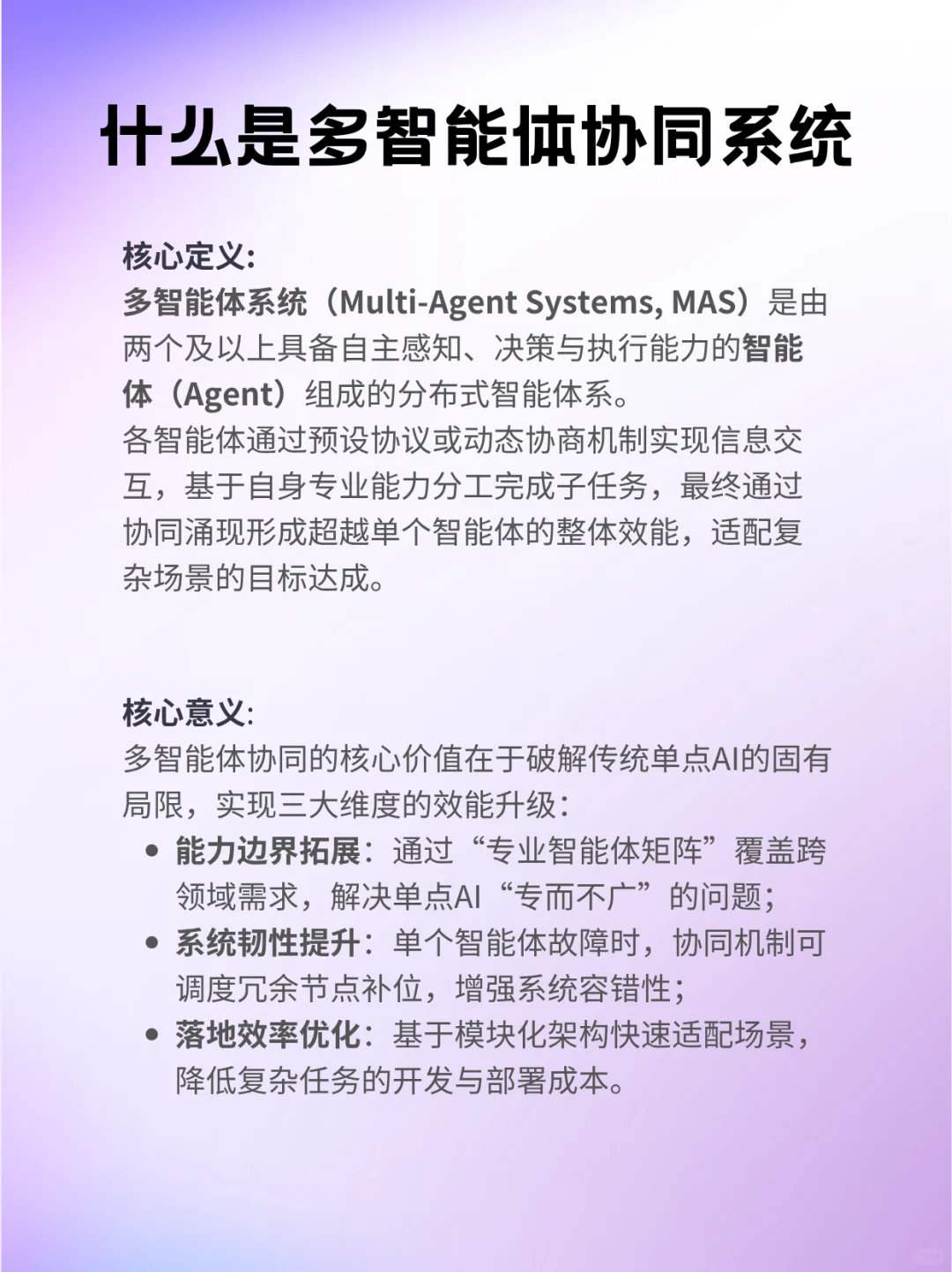 2⃣️为什么要推动多智能体协同? 核心就是“1+1>2”:再强大的单一模型也存在局限——例如大语言模型擅长文本生成,却在专业计算方面表现平平。通过多智能体协作,系统能灵活调用不同模型的“专业长板”,实现能力互补、效率倍增与系统可靠性的全面提升,并支持随时接入新的智能体以拓展能力边界。