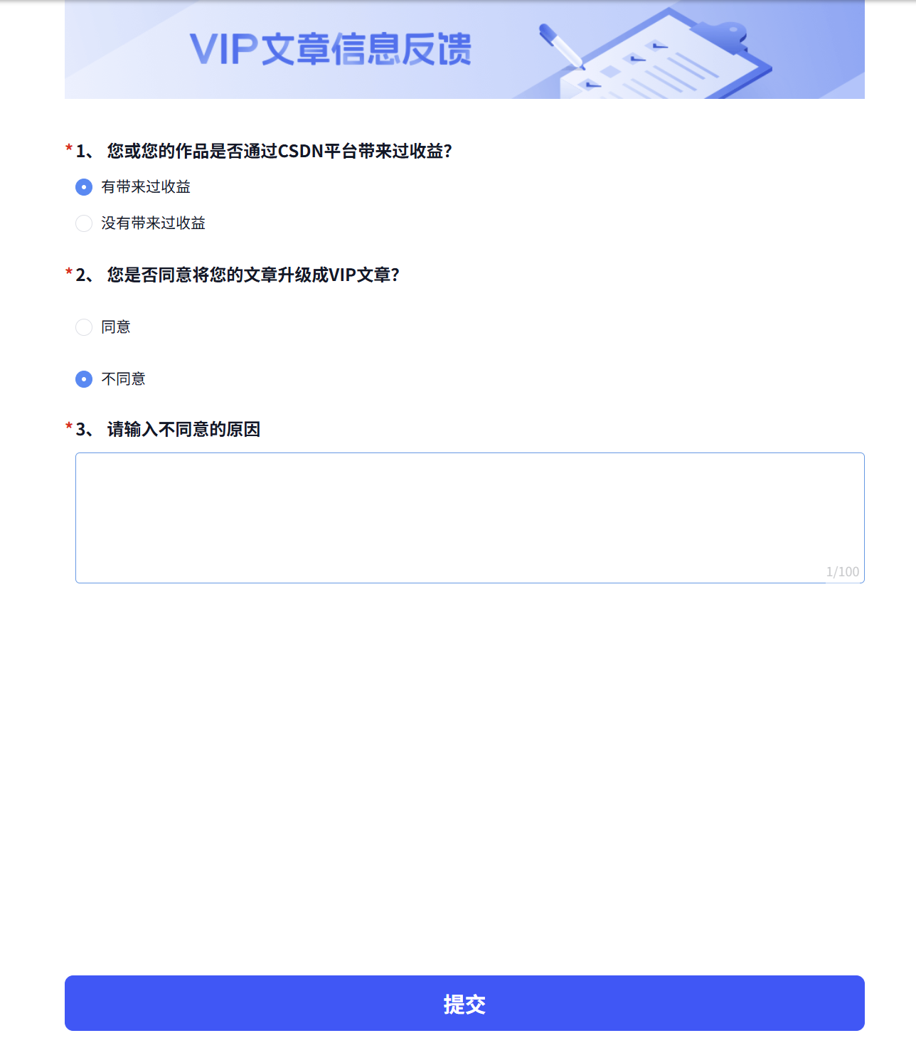输入不同意的原因,这个问题我觉得问题不是那么大,可能官方想了解一下博主不愿意设置vip文章的原因,后续针对这些问题做调整。