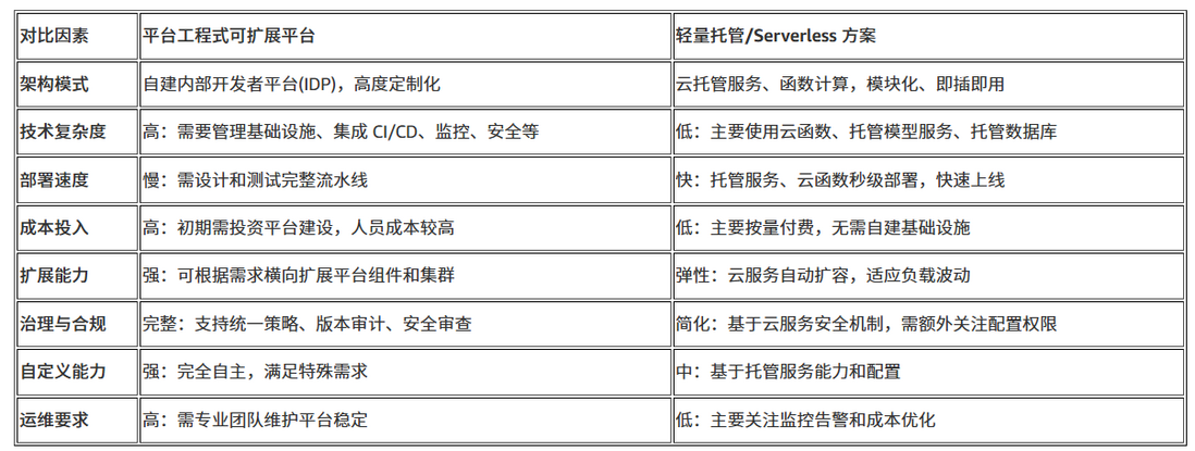 针对这两种诉求,我们提出两条建设路径:以平台工程为核心的可扩展平台,强调统一治理、强可控性和深度集成,适合已有平台团队、需要长期演进和严格合规的企业;轻量托管 / Serverless 快速落地方案,聚焦敏捷交付和弹性扩容,适合资源有限的小团队、PoC 项目或对基础设施依赖较低的业务单元。两种方案并无绝对优劣之分,而是面向不同组织规模、治理需求的差异化选择。