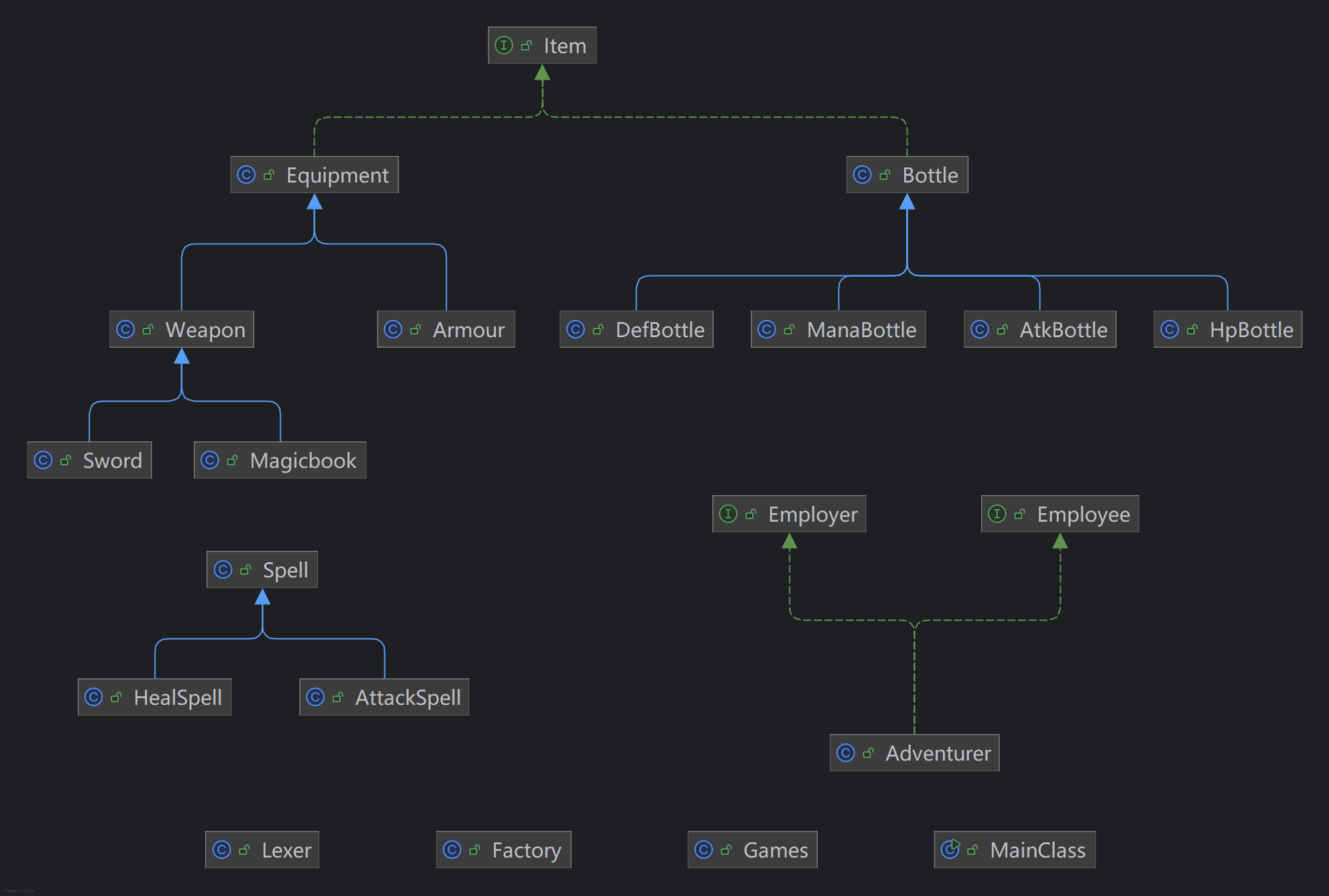 Adventurer:冒险者类,实现了Employer和Employee两个接口,表明一个冒险者既可以是别人的雇主,也可以是别人的雇员