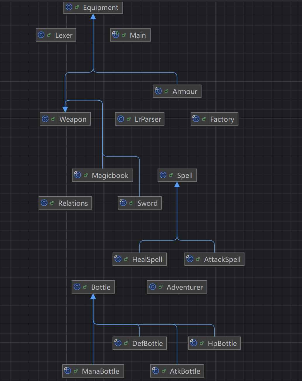 - Adventurer类,给冒险者定义了基础的属性例如 hp,atk,def,mana,money并初始化了他们还给了冒险者有个收集物品的地方例如 bottle ,equipment和spell。