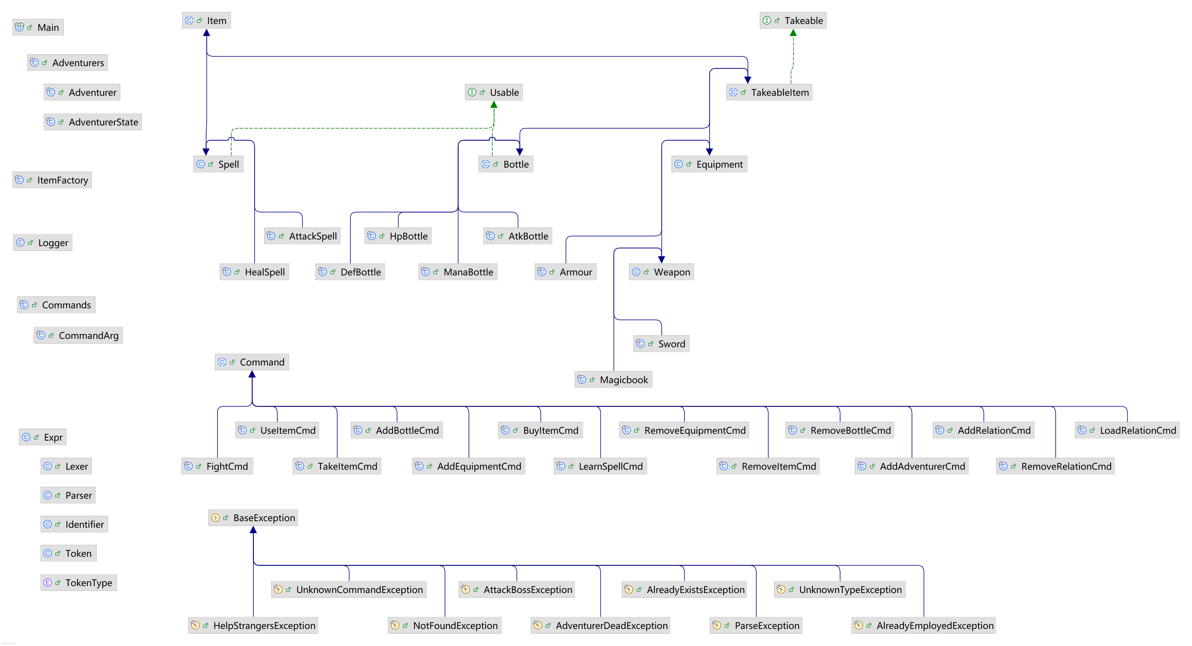 - 异常类:为了方便管理异常并判定特殊情况,我建立了一系列异常类派生自RuntimeException,同时,在主类中处理如AdventurerDeadException等异常,可以简化死亡检测。