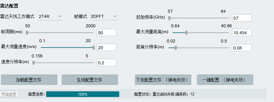 你好,6240芯片最多支持DataCube的尺寸为128x128(标注在《RS6x_7x_毫米波雷达评估_快速入门》3.2章节),按图上的配置来看,距离FFT点数为:10.454/0.08=130,向上取至2次幂,为256点,速度FFT点数为20/0.2*2 = 200,向上取至2次幂为256,因此按图上配置来看,DataCube尺寸超过了最大支持值,所以会报错。