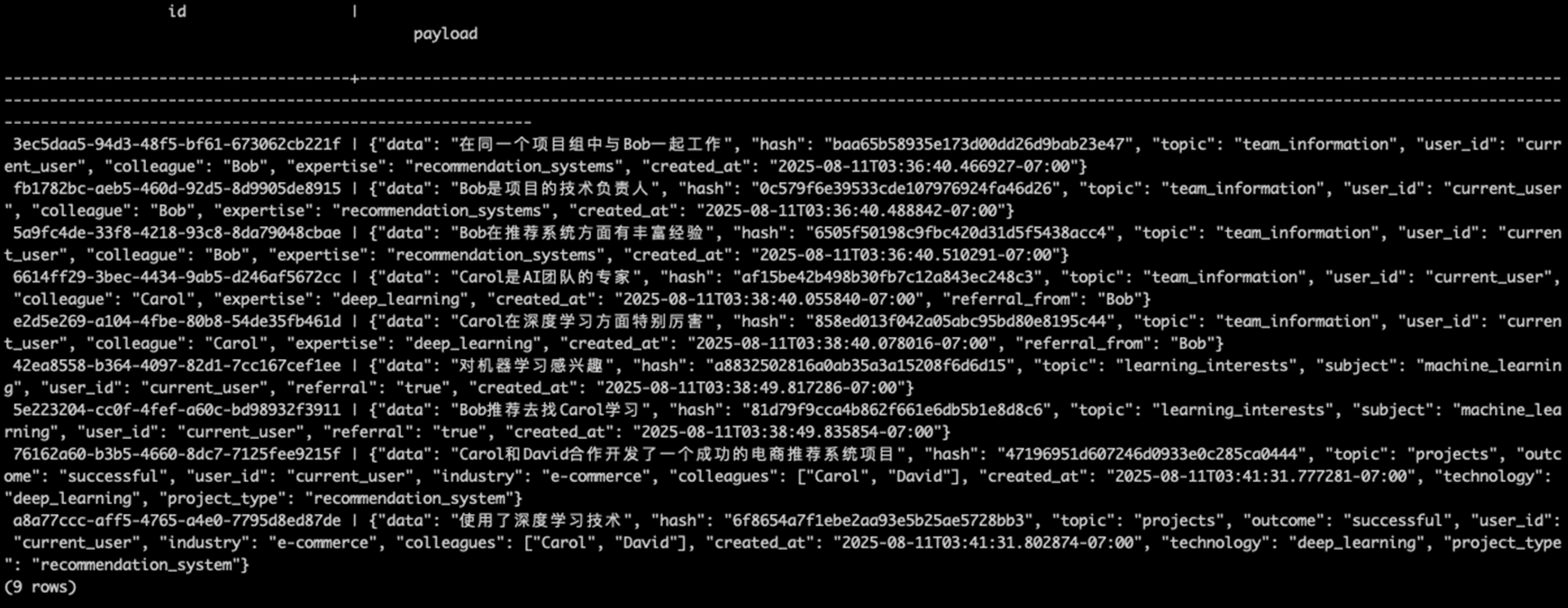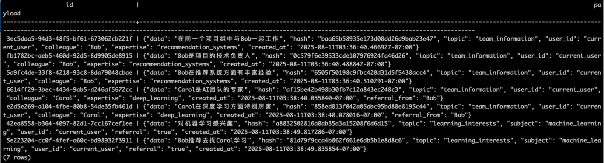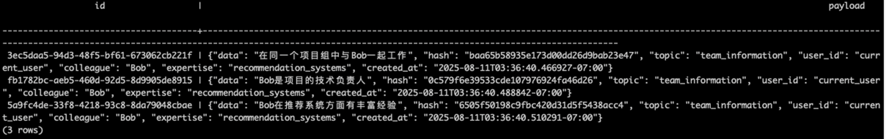 信息提取阶段:系统通过LLM和专门提示词进行深度语义分析,从”我和John在星巴克讨论AI项目”中提取工作关系、场所偏好、兴趣领域等多维信息。