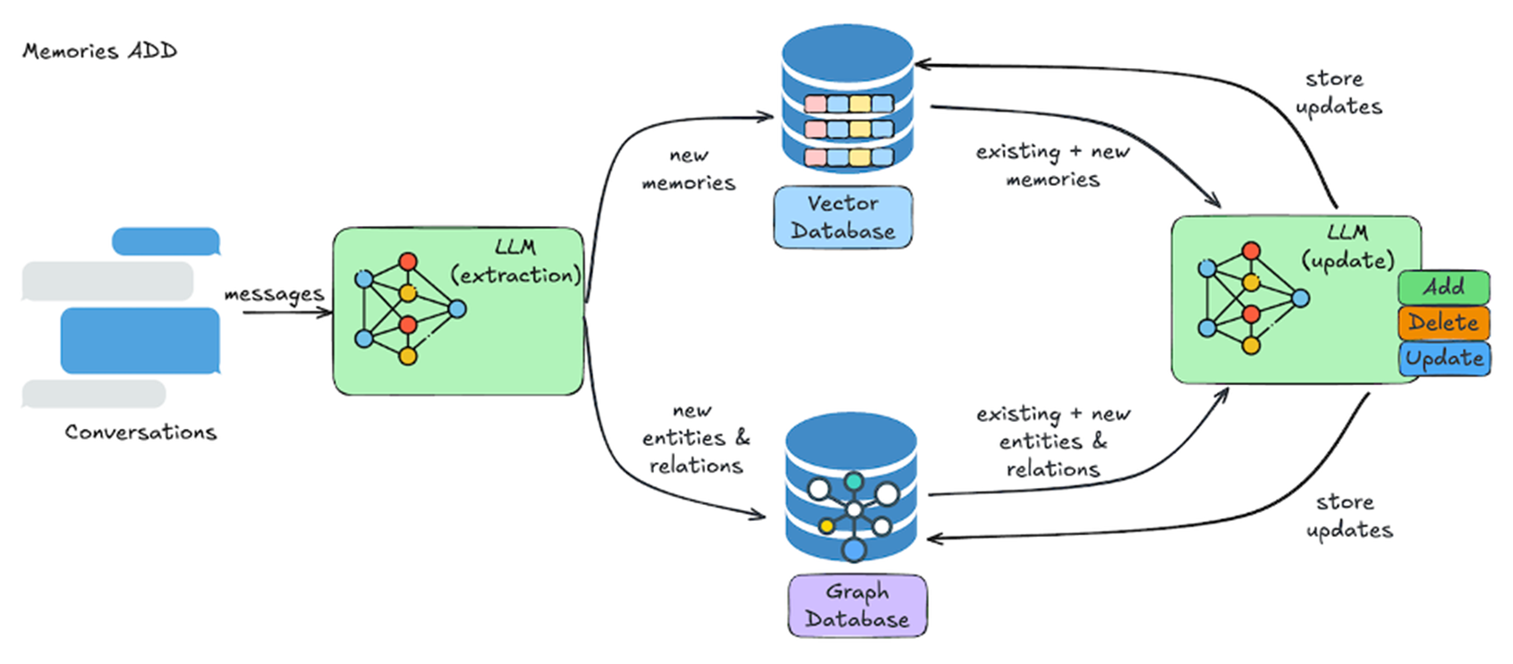 Mem0对于记忆的添加流程如下图所示。(图片来源:Mem0官方文档)