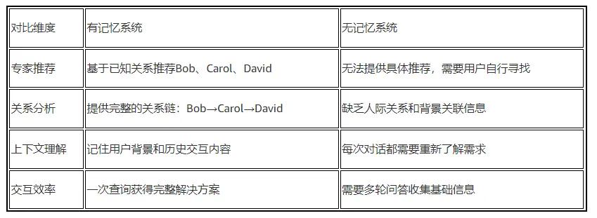 通过上述多轮对话演示,我们可以清晰地看到记忆系统与传统无记忆系统的核心差异: