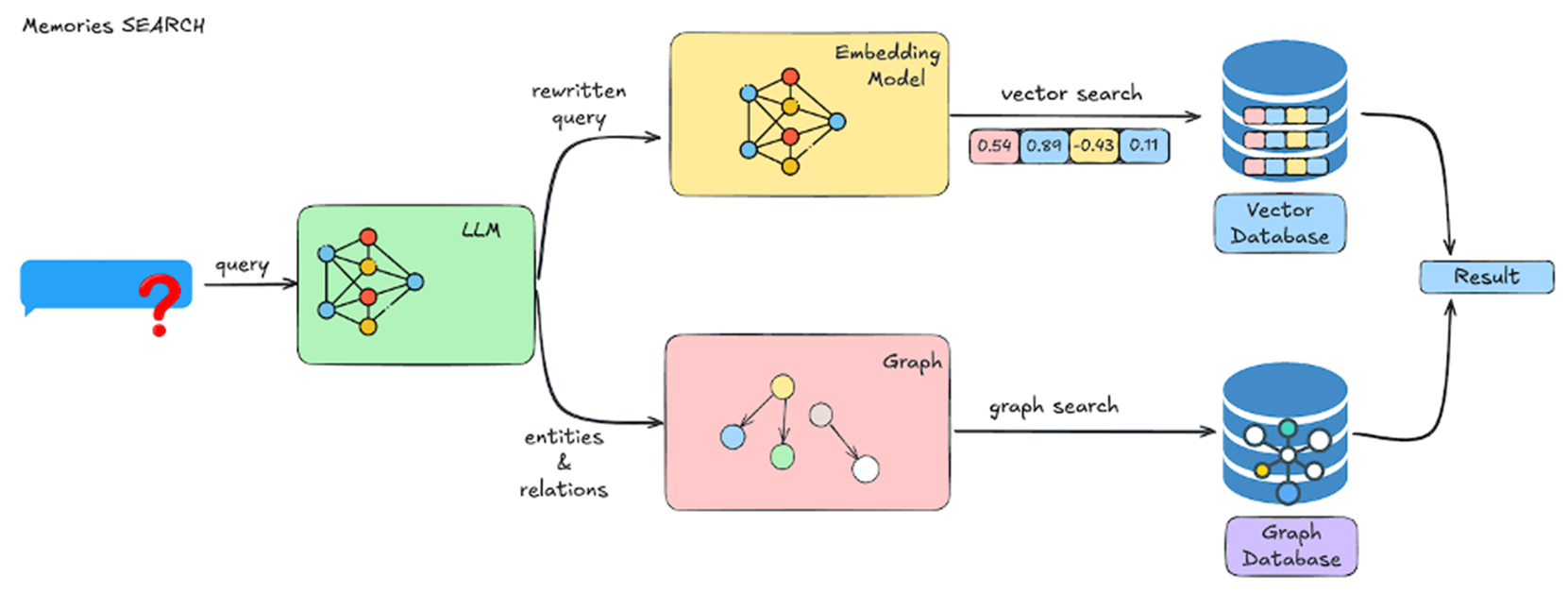 检索流程采用查询预处理、并行化搜索、结果整合三阶段设计,通过向量语义搜索和图谱关系搜索的并行执行,实现高效准确的记忆检索。