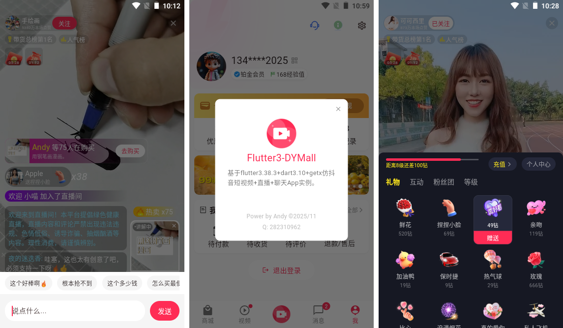 分享2025年12月最新爆肝研发flutter3.38.2+dart3.10+getx+media_kit仿写抖音app界面集成短视频+直播+聊天商城系统。