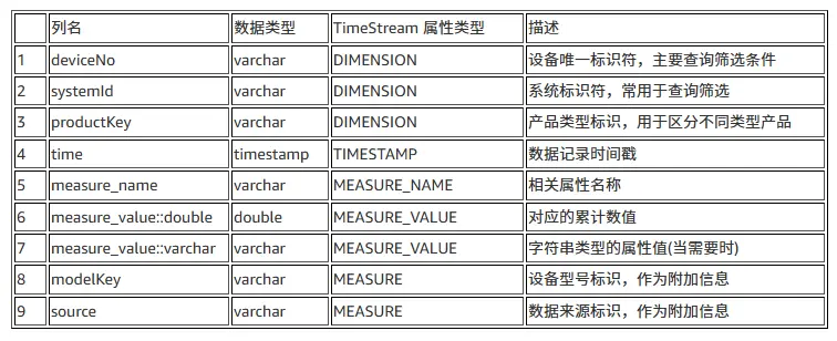 | 列名 | 类型 | TimeStream属性类型 | 说明 |