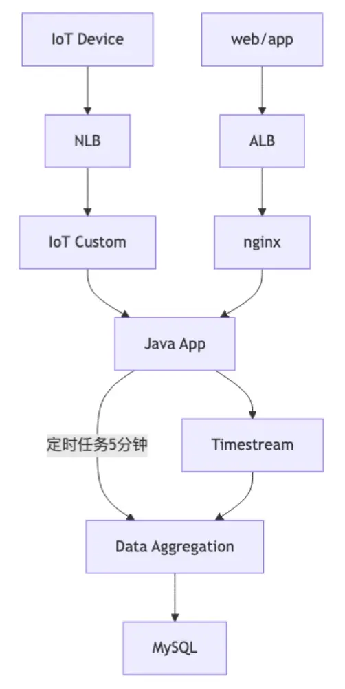 我们重点关注核心数据处理流程:服务端程序通过定时任务机制,每5分钟执行一次数据汇聚操作。系统采用线程池并发处理方式,从Amazon Timestream中查询和聚合时序数据,经过计算处理后写入MySQL数据库进行持久化存储。详细流程如下图所示: