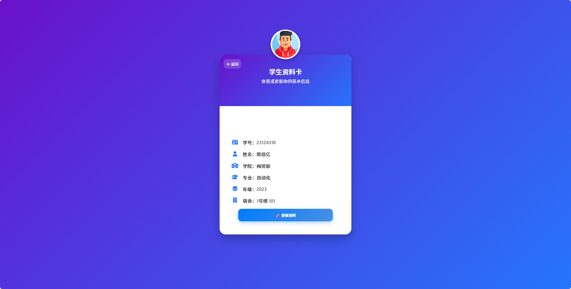 User Profile Dashboard: Built a profile management page where students can view and edit their basic information (avatar, name, contact details) and academic status. The backend successfully fetches and updates this data via the student information system API.
