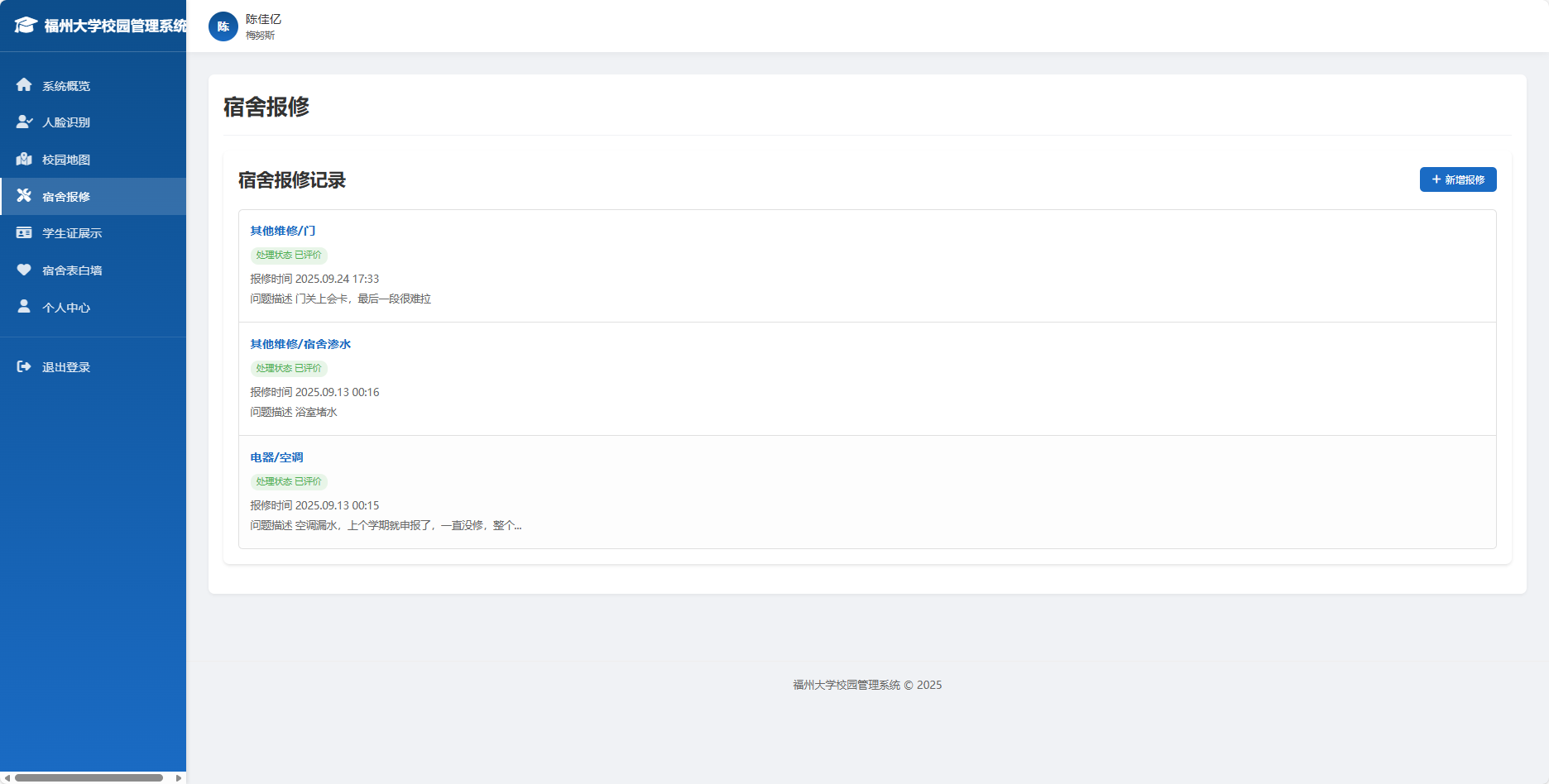 Dormitory Repair System: Developed a complete workflow from fault reporting to status tracking. Users can submit repair requests with descriptions and photos, and view the history and current status (Pending/In Progress/Resolved) of their tickets.