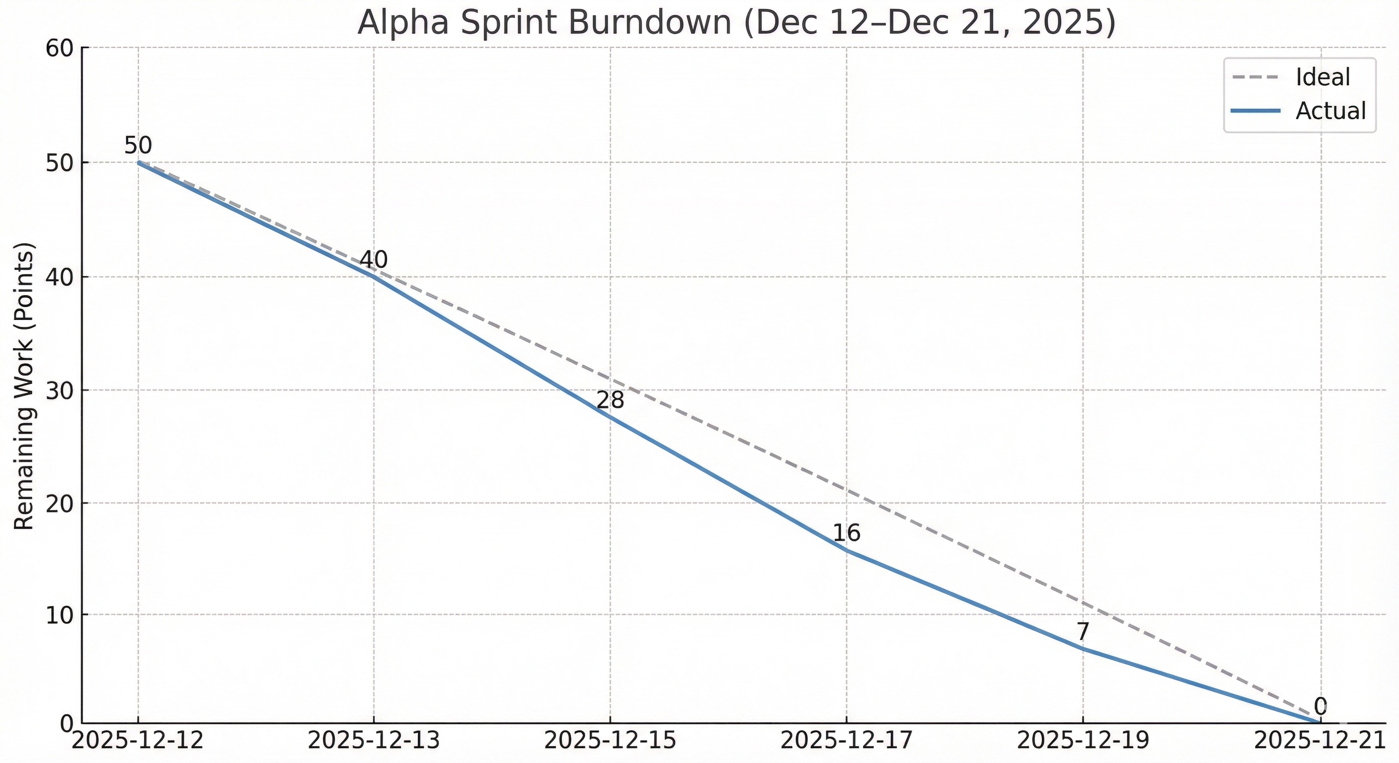 We use a simplified point-based burndown to track progress. Total sprint workload was initially estimated at 50 points, distributed across core modules and supporting tasks.
