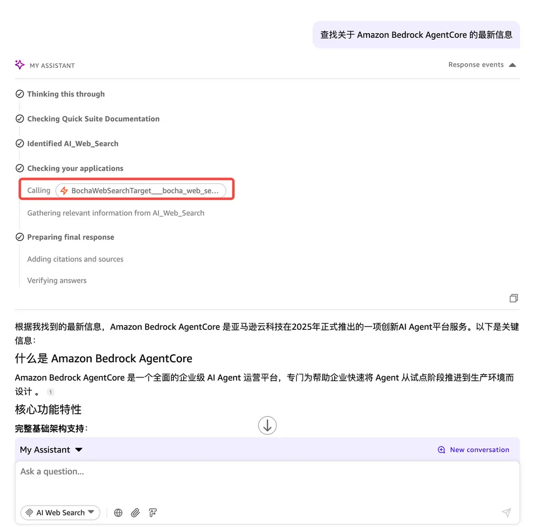 配置完成后,您可以在 Amazon Quick Suite 的 Chat Agent 中使用博查搜索。