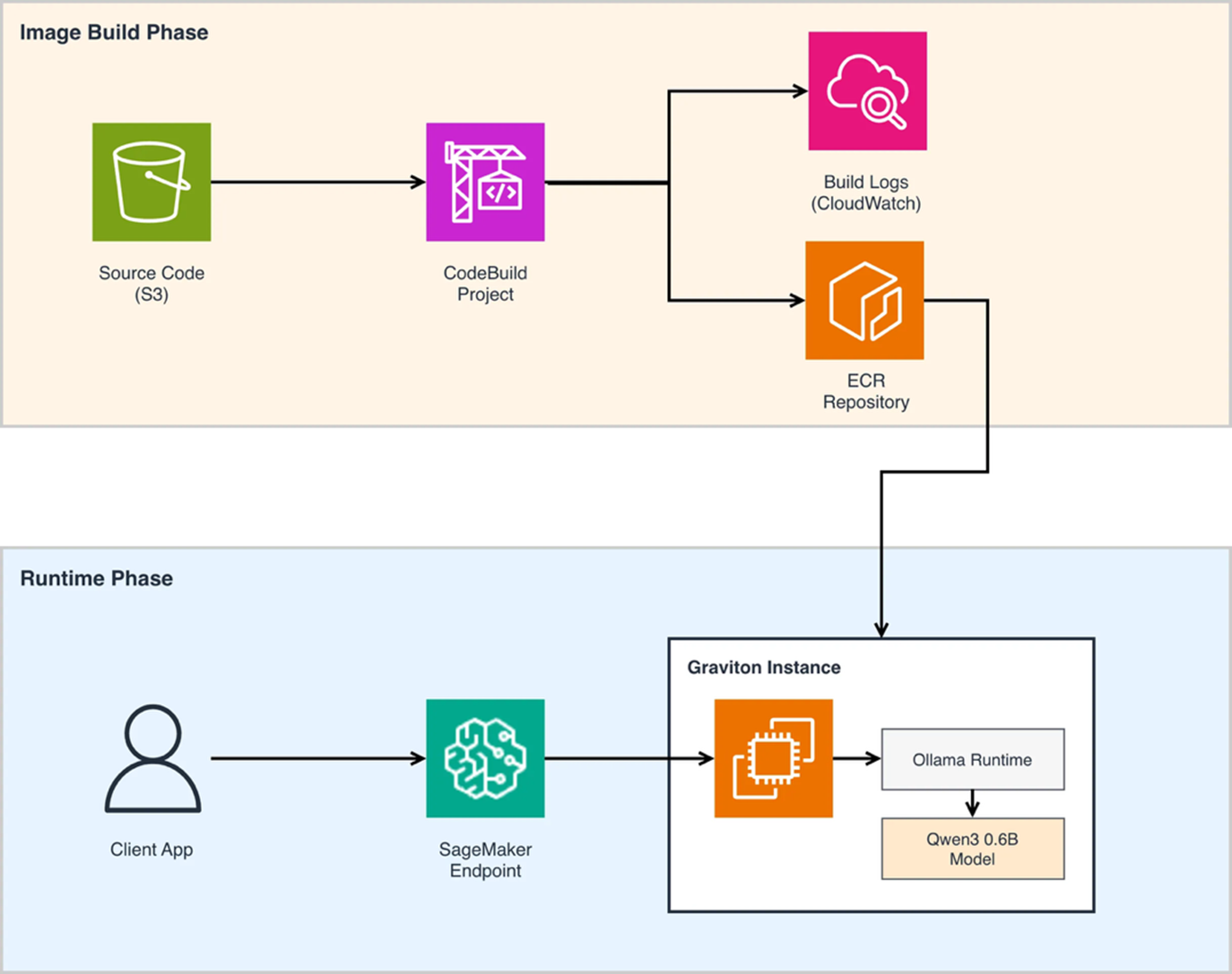 在运行时阶段(Runtime Phase) ,客户端应用通过 Amazon SageMaker Endpoint 发起推理请求。SageMaker Endpoint 将请求路由到运行在 Graviton 实例上的容器。在 Graviton 实例内部,Ollama Runtime 负责模型的加载和推理执行,Qwen3 0.6B 模型以优化的方式运行在 ARM 架构上。这种架构使得推理服务可以充分利用 SageMaker 的自动扩缩容、流量分配和模型版本管理等能力。