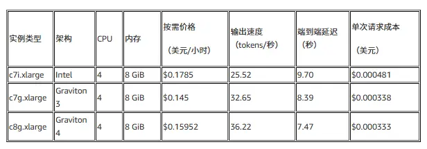 从测试数据可以清楚看到 Graviton 架构的成本优势。在相同配置(4 vCPU,8 GiB 内存)下,Graviton 3 c7g.xlarge 相比 Intel c7i.xlarge 的输出速度提升约 28%(32.65 vs 25.53 tokens/秒),端到端延迟降低约 14%,而单次请求成本下降约 30%。最新的 Graviton 4 c8g.xlarge 实例性能更加出色,输出速度达到 36.22 tokens/秒,比 Intel 实例快约 42%,端到端延迟仅 7.47 秒,单次请求成本进一步降至 $0.000333。