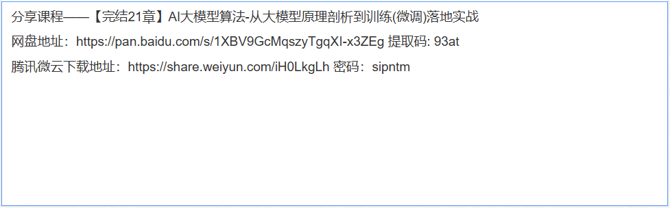 给大家分享一套课程——【完结21章】AI大模型算法-从大模型原理剖析到训练(微调)落地实战
