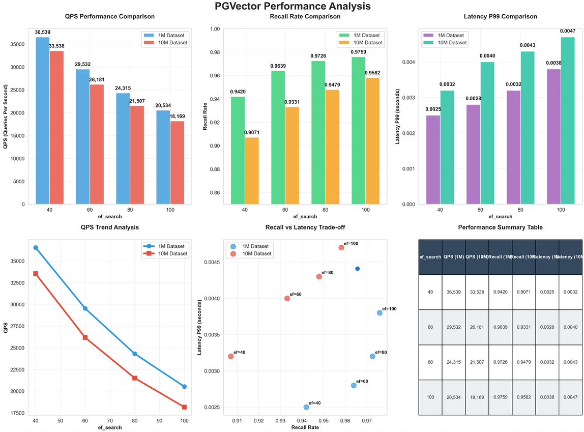如下是在Amazon RDS for PostgreSQL db.r8g.16xlarge规格下使用VectorDBBench进行100并发线程进行压测,每次压测时长300s,分别在Performance768D1M和Performance768D10M两种数据集下,不同ef_search下的性能表现: