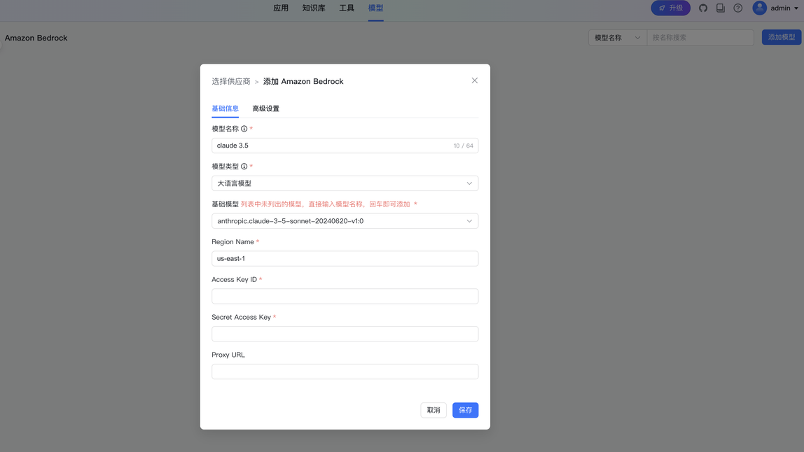 首先需要添加LLM模型和Embedding模型,MaxKB 支持Bedrock模型,可以在模型配置页面进行添加,具体的操作如下: