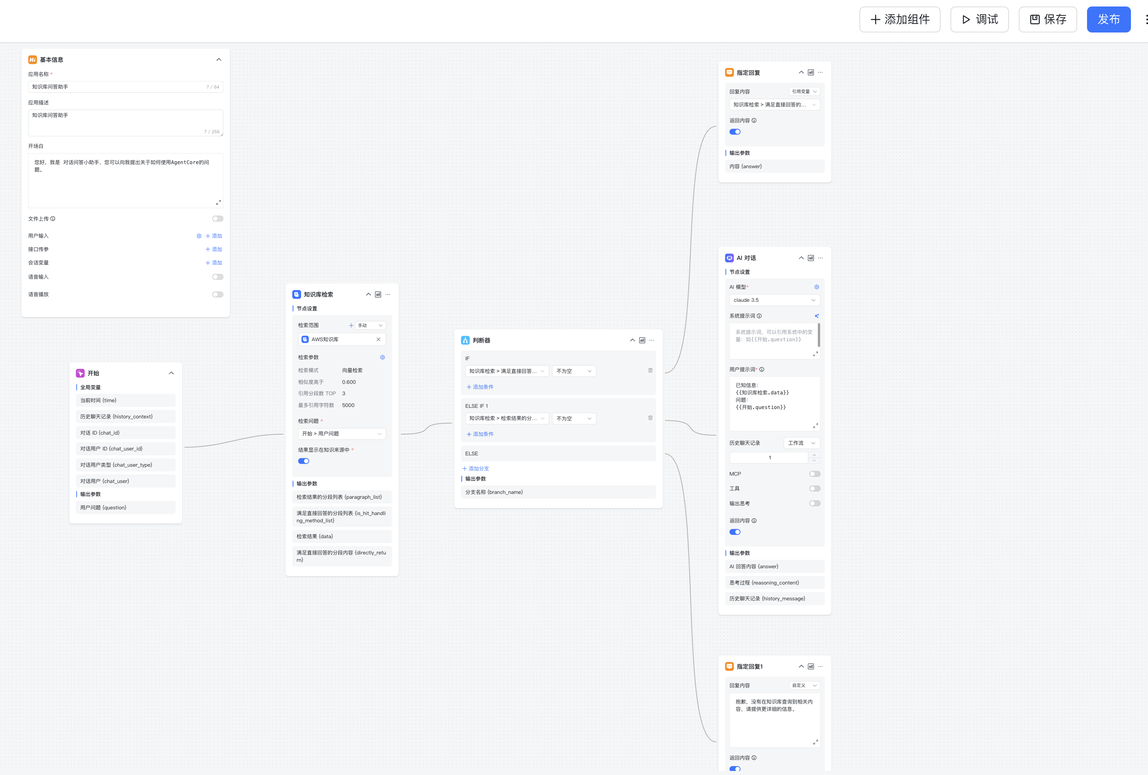在创建对话助手页面,可以配置对话流程,MaxKB具有灵活的流程配置功能。配置完成,用户可以针对对话流程进行调试和发布。