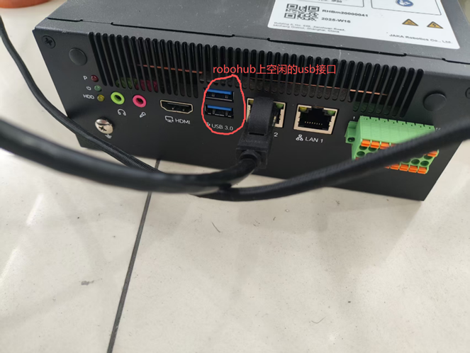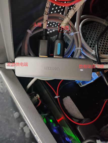 USBhub的数据端插在飞腾usb口上(为保证带宽足够,不将左臂相机也接到usbhub上),外部供电端插在JAKA robohub空闲的usb接口上,起到外部供电,保证相机功率稳定的作用。左臂相机则插在飞腾的usb口。其余usb设备保持不变。