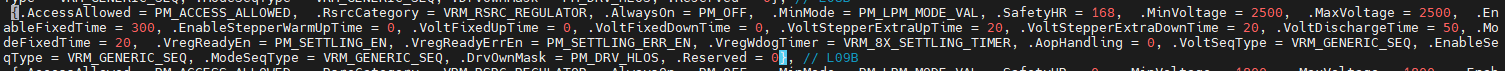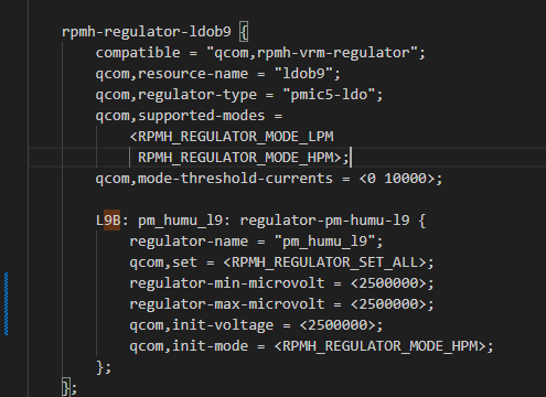 SafetyHR参数:SafetyHR = 168是硬件安全阈值,需确认2.5V是否在该阈值允许的范围内(部分VRM的SafetyHR会限制电压下限)。VoltStepperExtraUpTime、VoltStepperExtraDownTime等时序参数,可能是2.5V切换时的时序不满足硬件要求,导致电源异常。MinMode = PM_LPM_MODE_VAL,需确认2.5V下设备是否支持LPM模式(部分模块在低电压下需要切换到特定工作模式)。实际测量当前是2.9V,可能该电源轨(L9B)对应的硬件模块本身不支持2.5V(比如外设、传感器的供电电压下限是2.9V),强行改2.5V会导致硬件无法工作,进而系统起不来。