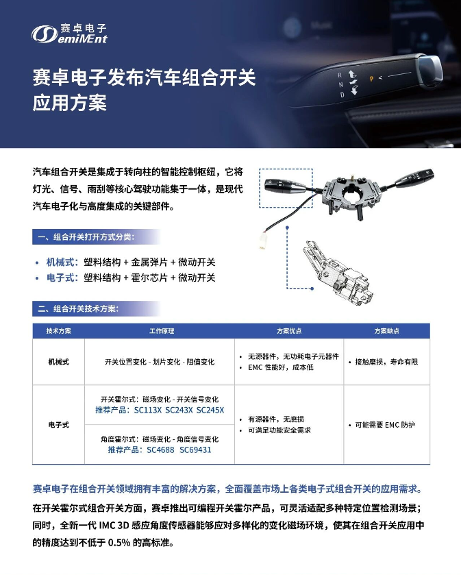 汽车组合开关是车身控制模块需求中的核心智能控制枢纽,集成灯光、信号、雨刮等驾驶功能,是现代汽车电子化、集成化的关键部件。小编作为芯片人,推出的汽车组合开关应用方案,既是高性价比的国产替代方案,也能覆盖多场景的汽车电子需求!!