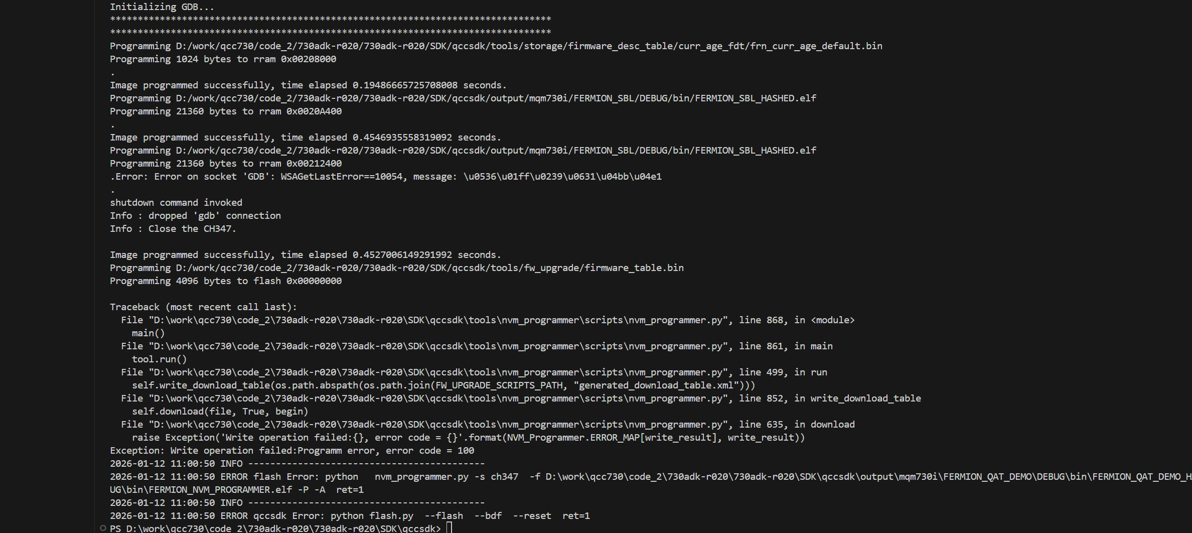 nvm_programmer.py对应的烧录工具版本与QCC730 SDK(qccsdk)版本匹配。日志中出现“Write operation failed: Program error, error code = 100”,需要排查: