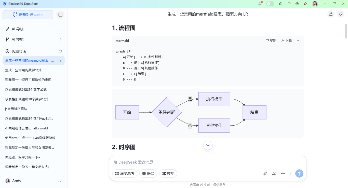 electron39-deepseek支持流式打字、深度思考、latex数学公式及mermaid图表渲染功能。