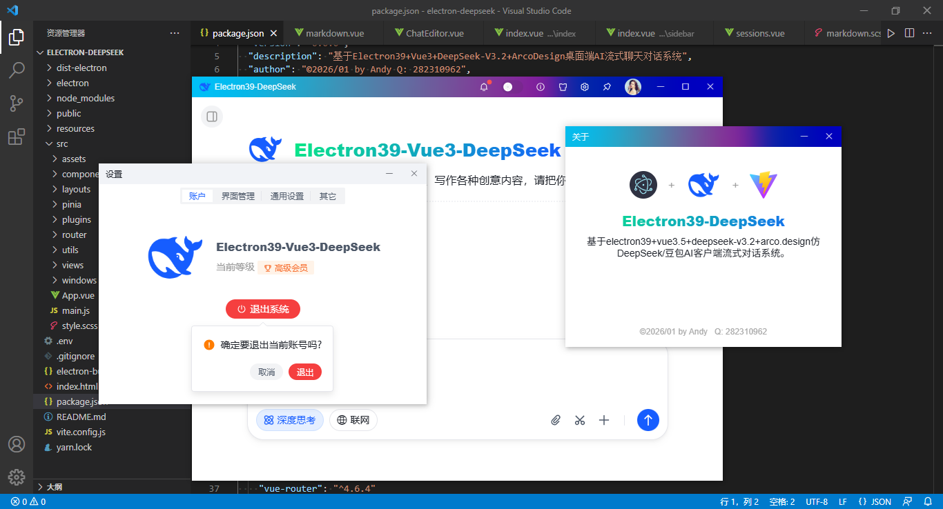 基于最新跨平台框架Electron39.2+Vite7搭建项目,调用deepseek-v3.2聊天模型。
