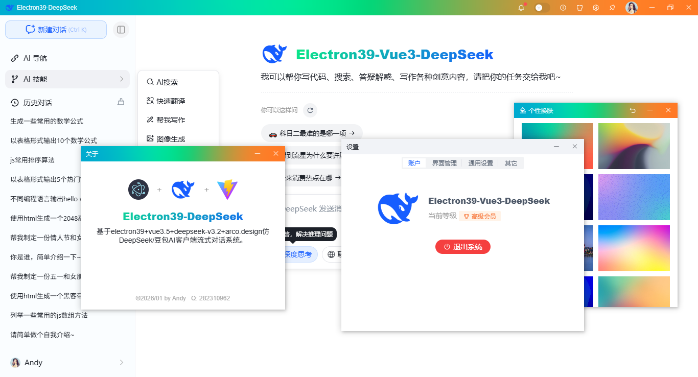 分享Electron39-DeepSeek-Vue3AI跨平台AI模板|electron39+vite7+deepseek-v3.2+arco智能ai聊天助手。