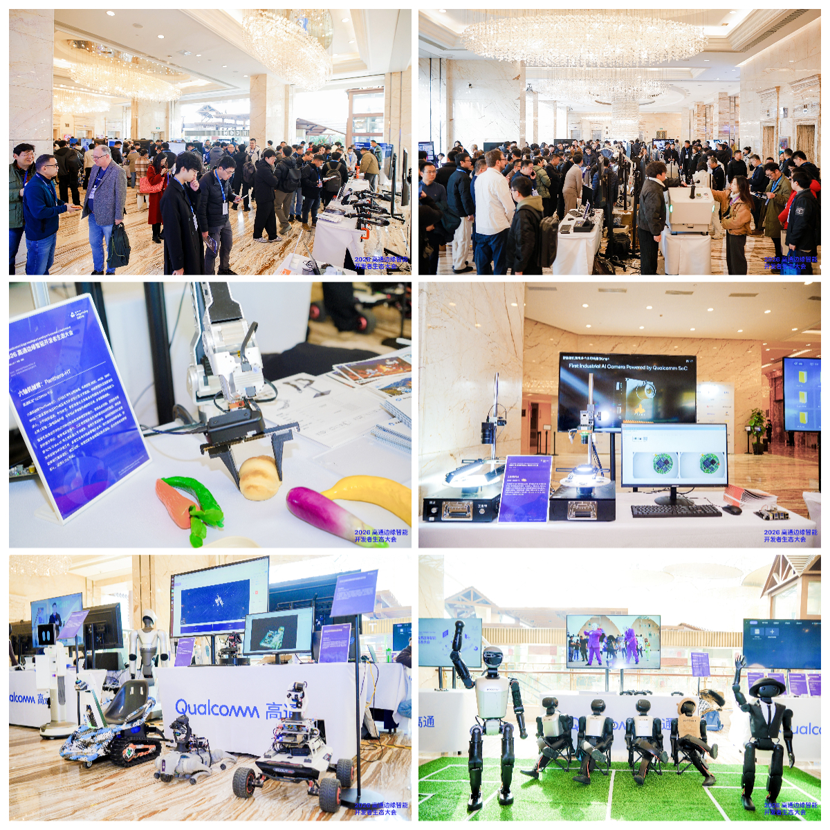作为大会的亮点环节,特设主题展区则集中呈现丰富的生态协同创新成果。展区汇集80余项基于高通平台的边缘智能展品,包括人形、四足、轮式等各形态机器人,以及应用于智慧交通、智能安防、商业零售、家庭陪护等多元场景的智能终端,涵盖从个人创作、高校项目到企业原型与量产产品的完整创新链条。