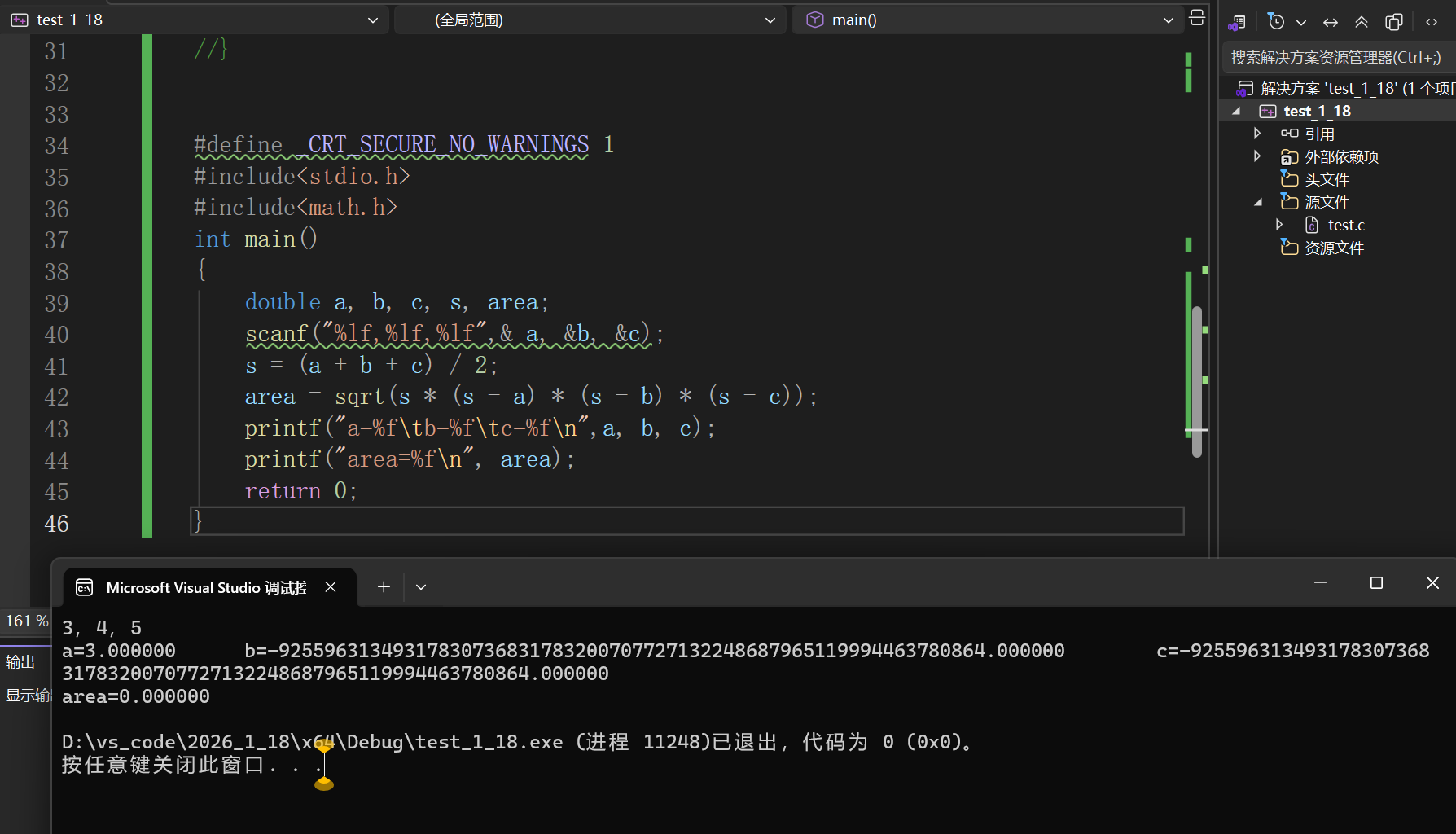 跟视频学了一段输入三角形三边,计算三角形面积的程序,用的VS2026,可以执行,但是为啥啊a,b,c,不是我输入的结果,也算不出来??