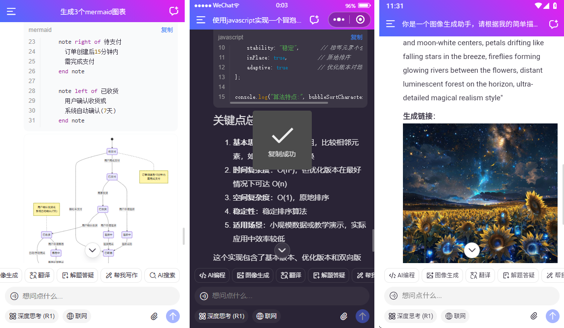 uniapp-vue3-ai支持深度思考、代码复制、katex公式、图片预览、链接跳转等功能。