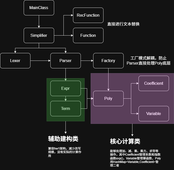 这是我第一次作业的架构,在第二次作业仅仅只是引入了新的元素,没有进行较大改动,但是在第三次作业,我将很多 Factor 类去掉了,原因在于即使我实现了它们,计算时仍然总是用 getPoly() 来工作,既然如此直接用 Poly 不就好了 ,因此,我的重构策略如下: