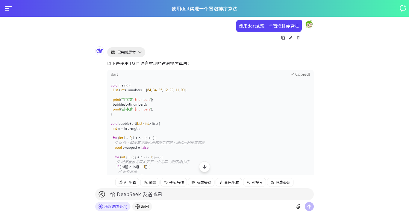 分享最新跨平台技术Flutter3.41+Dart3+Dio+Getx+Markdown深度聚合DeepSeek-chat纯手写搭建app版智能流式对话ai系统。新增深度思考模式、latex公式、mermaid图表,代码高亮/复制代码、图片预览、链接、表格等功能。